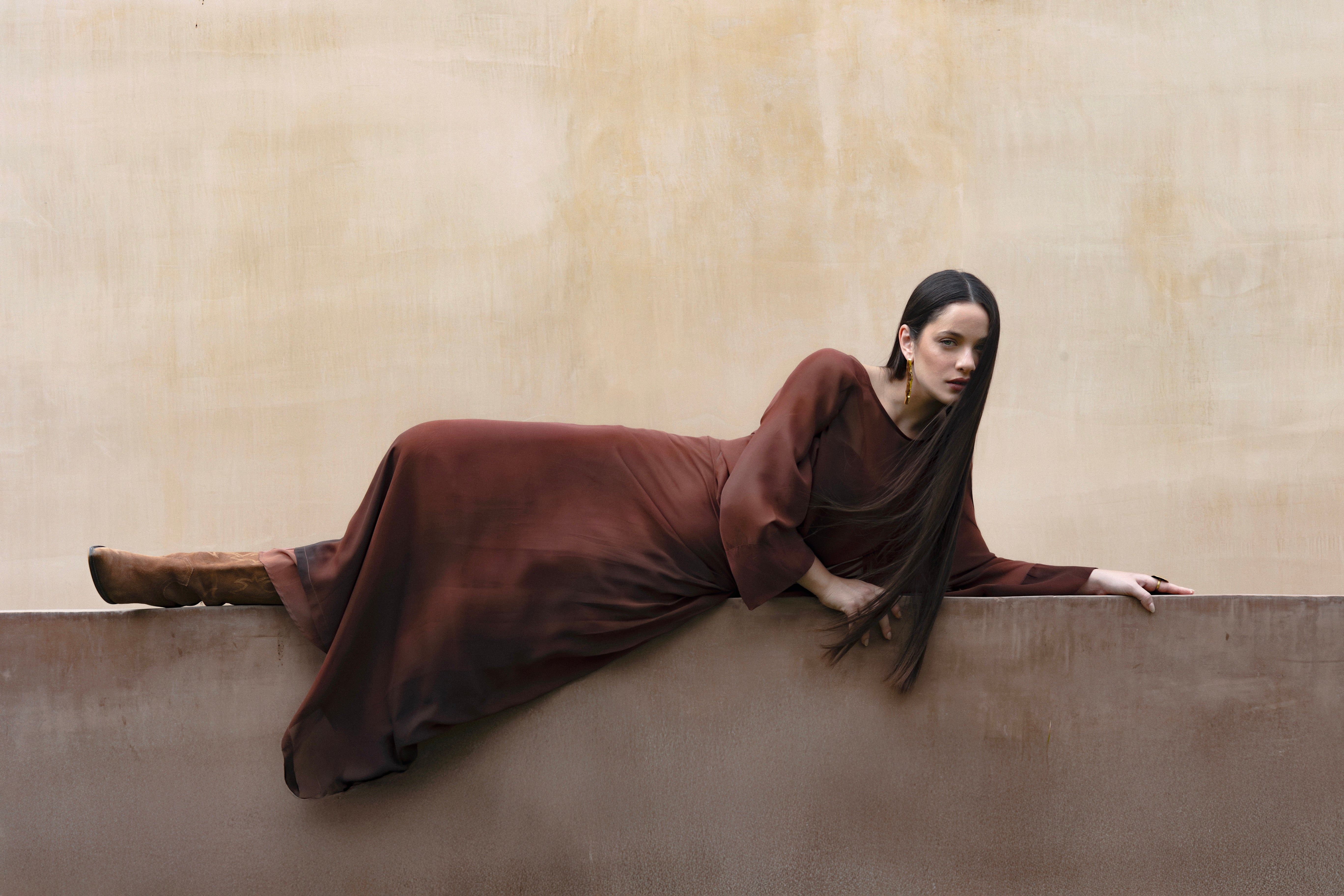 Long silk dress for woman, chic and elegant. Open back, transparent, costume print.