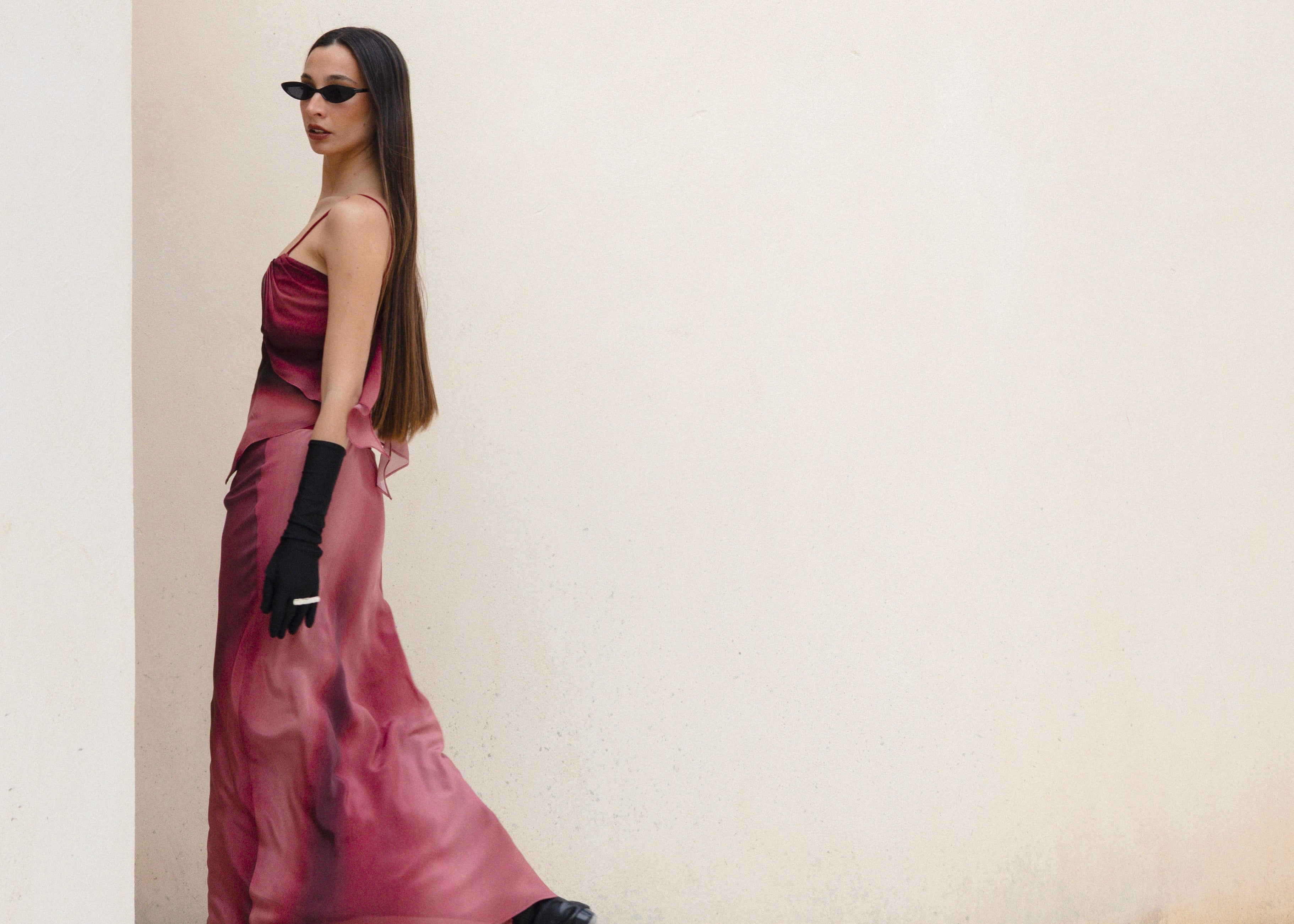 Long silk dress for woman, chic and elegant. Open back, transparent, costume print.